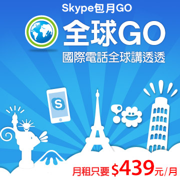 Skype全球GO專為具有國際視野的人士設計,滿足您全球講透透的需求。該方案涵蓋全球63個國家地區的市話/長途和部份國家的行動電話(適用國家:註一),只要月付$439元,不再需要擔心自己的國際電話費失控超支。Skype全球GO讓您和全球快速接軌,掌握全世界脈動。